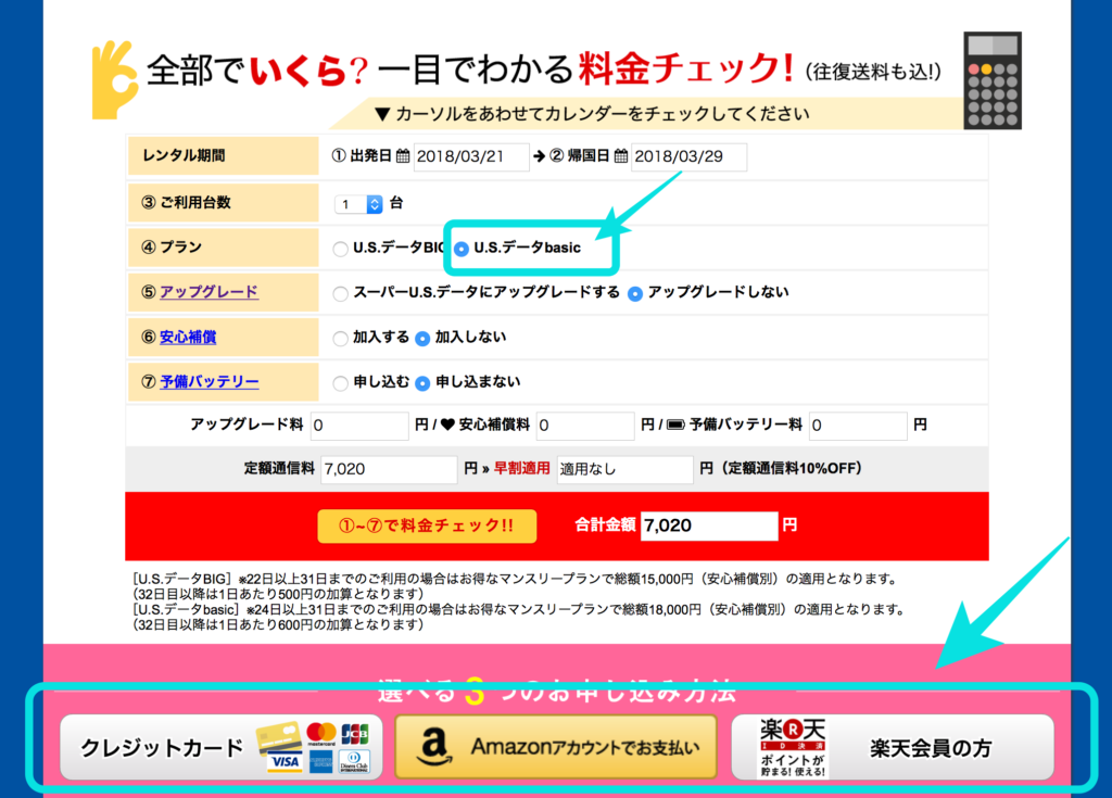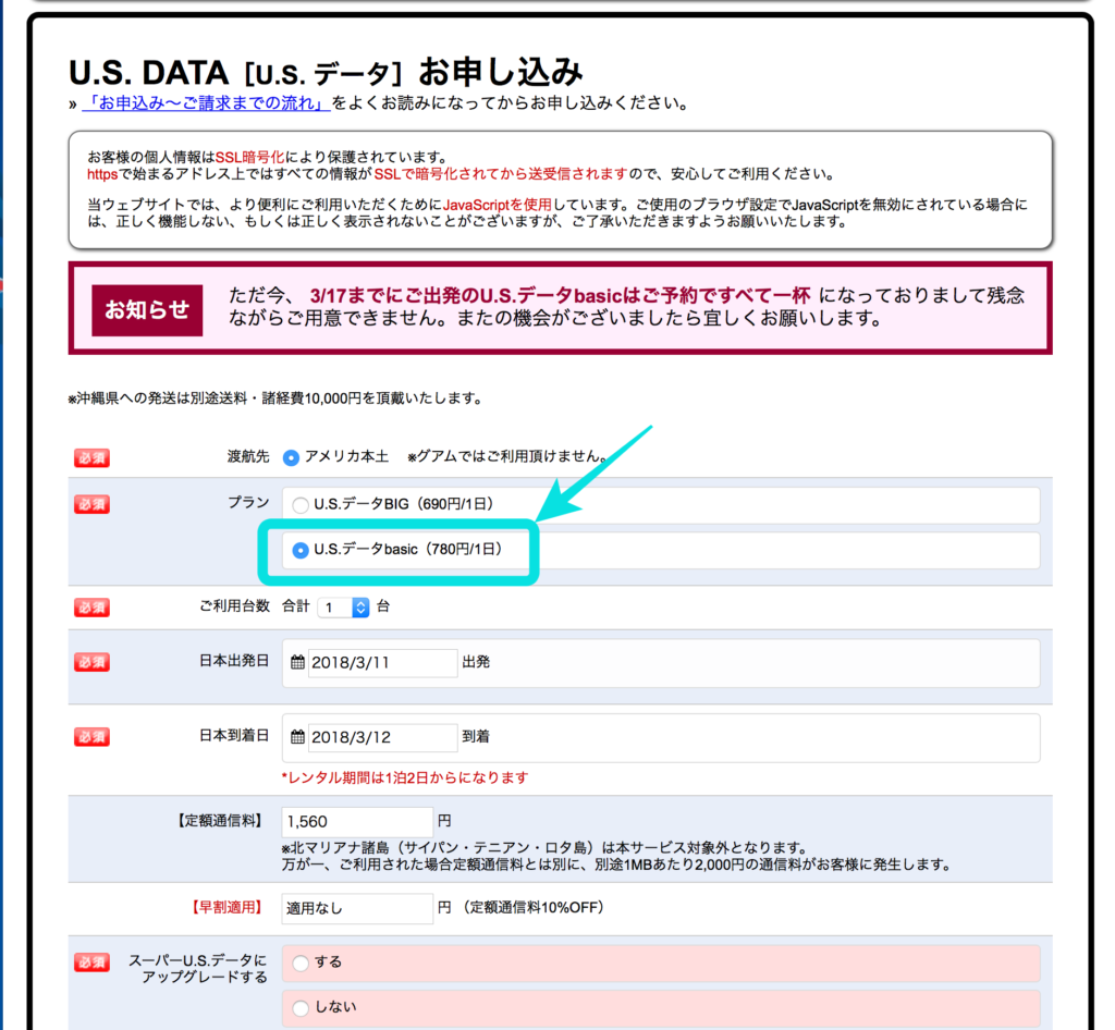 プランの項目のU.Sデータbasic(780円/1日)になっているか用チェックです。