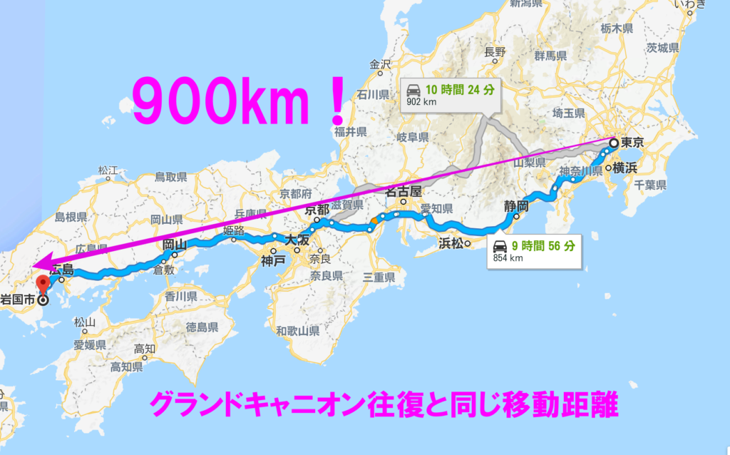 900kmの移動といえば、東京から山口まで行っちゃいます。