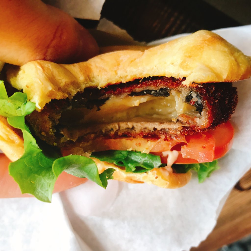通常パティ、お肉のところにフライで揚げたマッシュルームとチーズが挟まれたハンバーガーです。
