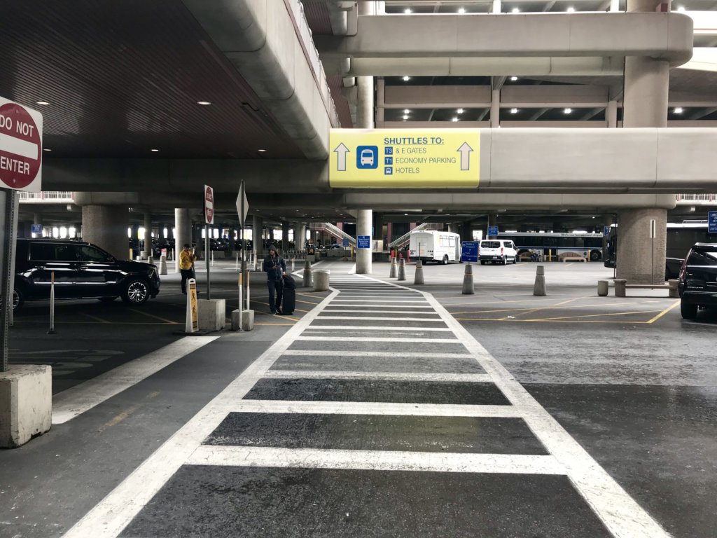 右側にオレンジの看板でInter-Terminal Shuttle Stopという看板が見えてきます。