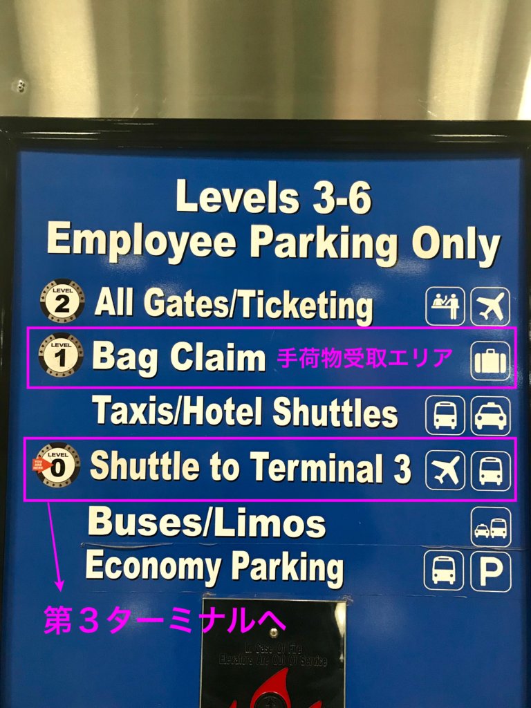 第3ターミナルのシャトルバス乗り場は1Fの荷物受け取りエリア(Baggage Claim)の横です。