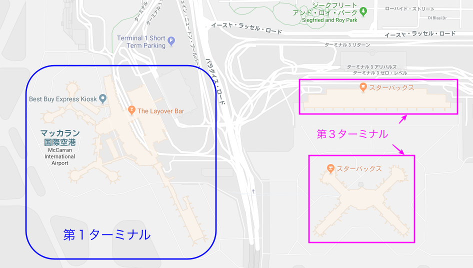 ラスベガス空港(正式名所:マッカラン国際空港)には第1ターミナルと第3ターミナルがあります。(第2ターミナルは存在しません。)