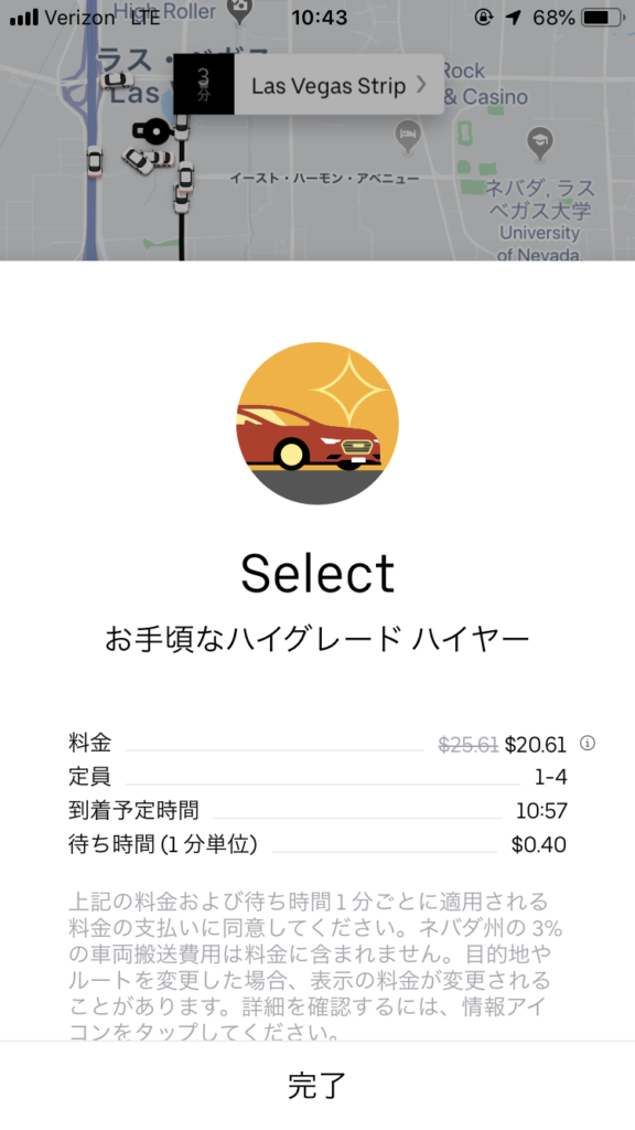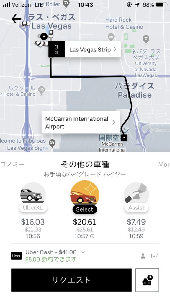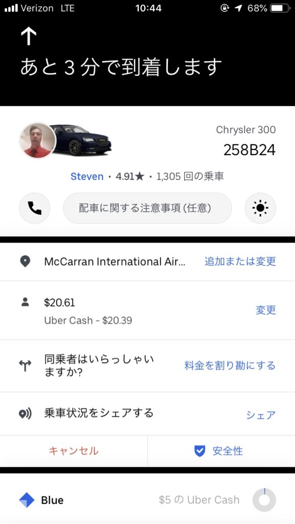「本当は今回の企画で、Uber SUV(最上位ランク)に乗りたかったけど、ラスベガスでは最上位ランクのサービスはなかったです。(涙)」