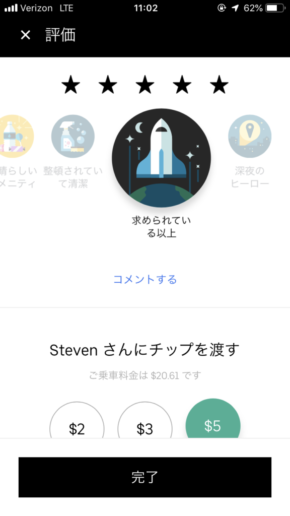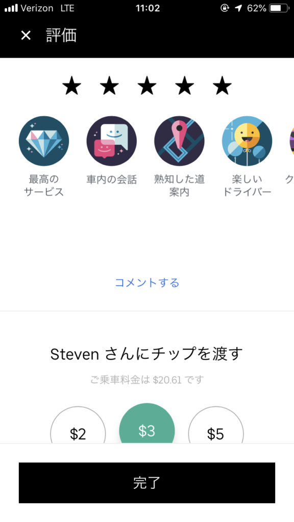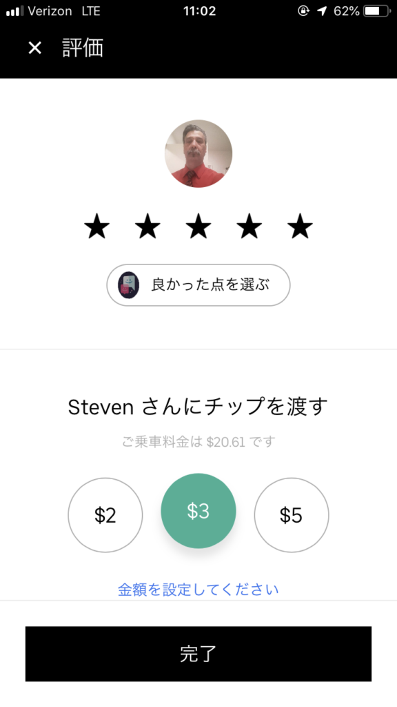 運転手の評価もUber Xより評価の高い人が運転してくれるワンランク上のサービスです。