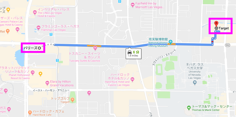 ラスベガス・ストリップの中心地、フォーコーナーズにあるバリーズホテルから車で10分以内の場所にターゲットはあります。