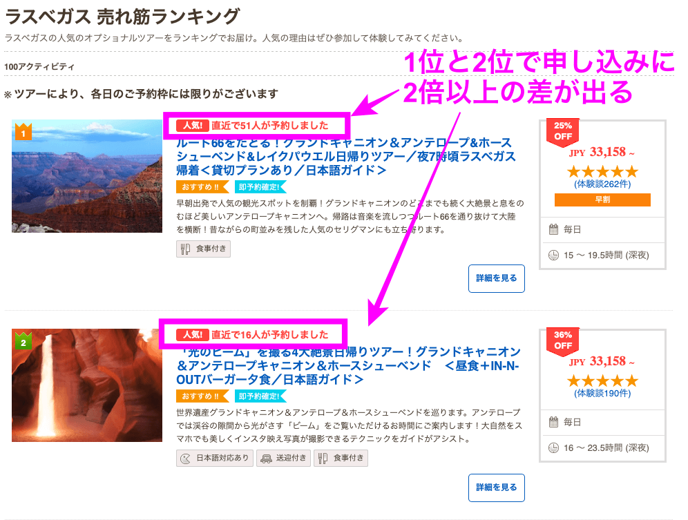 ちなみにベルトラは直近で何人の人が申し込んだか開示しているため、旅行者側の立場でも1位と2位の申込みの差を確認することができるようになっています。