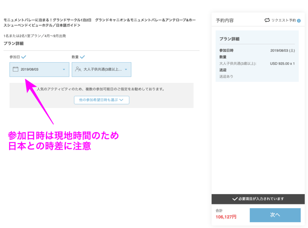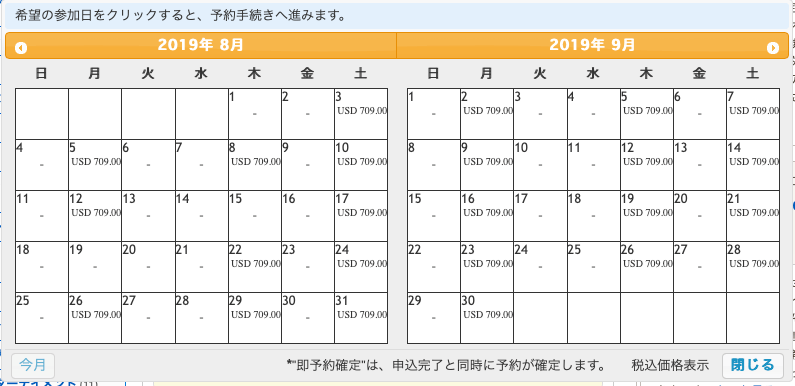 この時ツアーの金額がドル(USD)表示でわかりづらい方は右上をクリックすることで円(JPY)表示に切り替えできます。