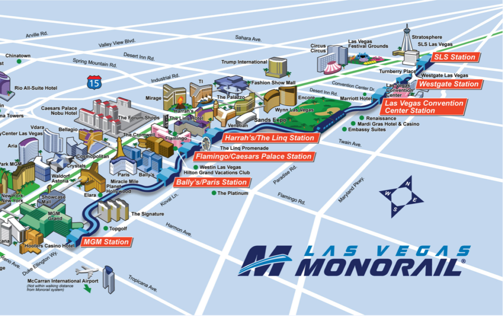 有料のモノレールはストリップの東側のホテルMGMグランドからSLSホテルまで7ヶ所。