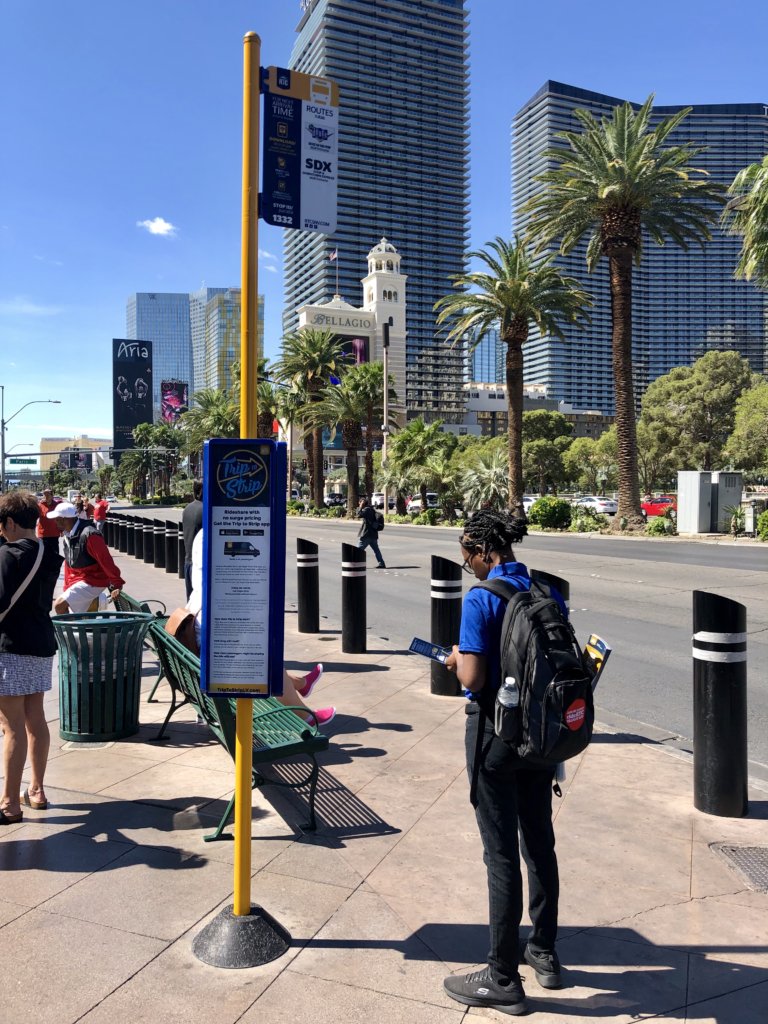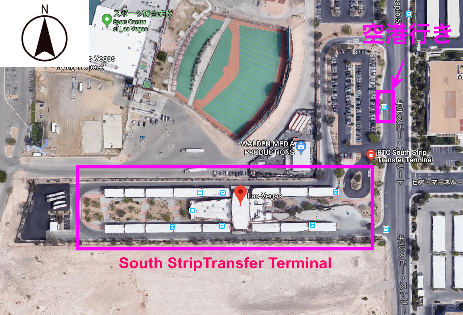 バスに乗って空港に行く場合、まずは南側方面のSDX(2両連結)に乗り、South Strip Transfer Terminalを目指してください。