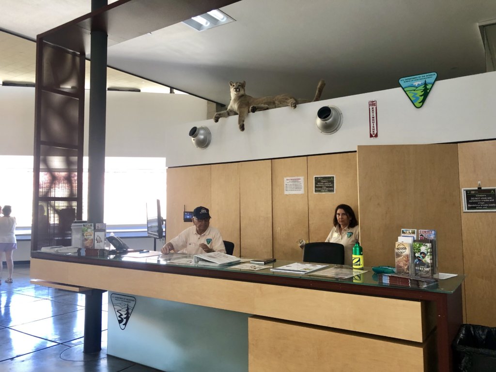 インフォメーションセンターの受付窓口です。さっそく頭上にマウンテンライオンの剥製が飾ってあります。