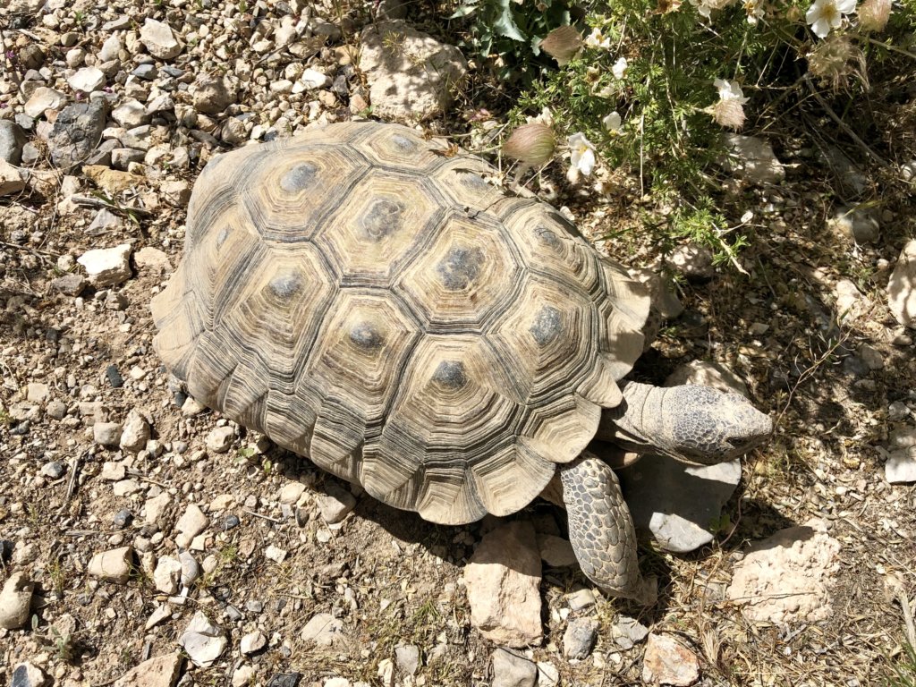 展示パネルを見学中、なんと野性のリクガメが出現しました。砂漠ゴファーガメと呼ばれるリクガメです。