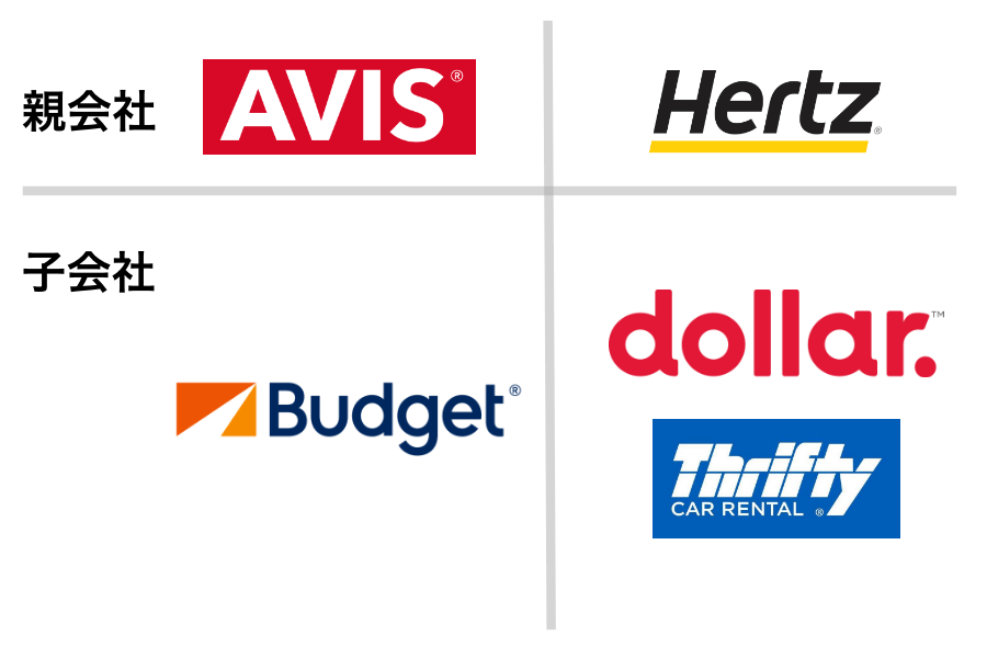 Budgetバジェット、dollarダラー、Thriftyスリフティはコスパ重視のレンタカーブランドです。