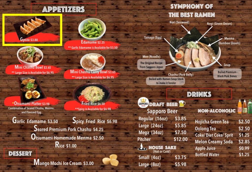 | 2. 餃子 | 3.88ドル |