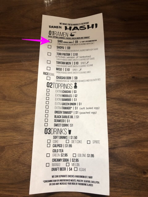 ↑レシートのような紙がラーメンHashiのメニュー表です。