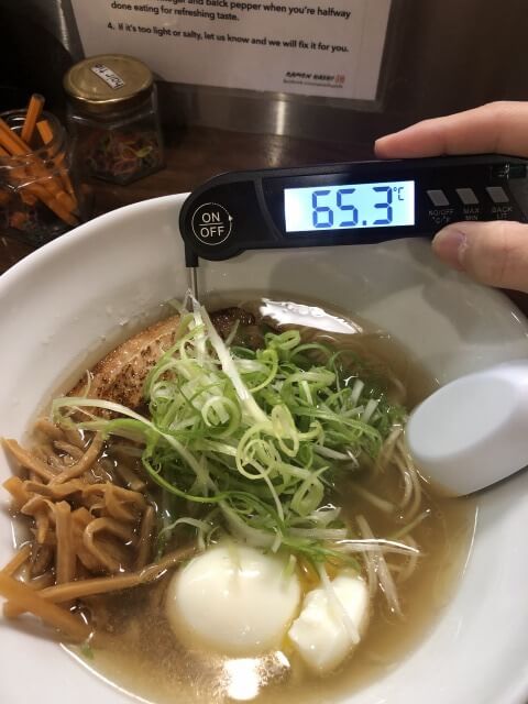 ちなみにラーメンの適温は70℃〜80℃といわれていますので、今回の塩ラーメンは65.3℃で少し基準値を下回りました。