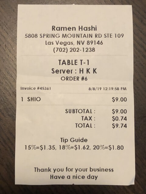 今回はサイドメニューがないお店のため、塩ラーメンのみで9.00ドルです。