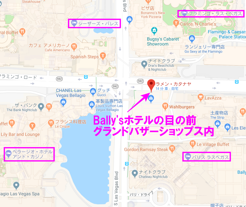 日本人がよく泊まるホテル、フラミンゴ、ベラージオ、バリーズ、パリスホテルから歩いて行ける距離にある。