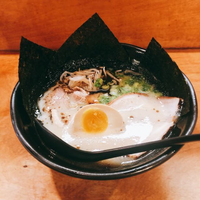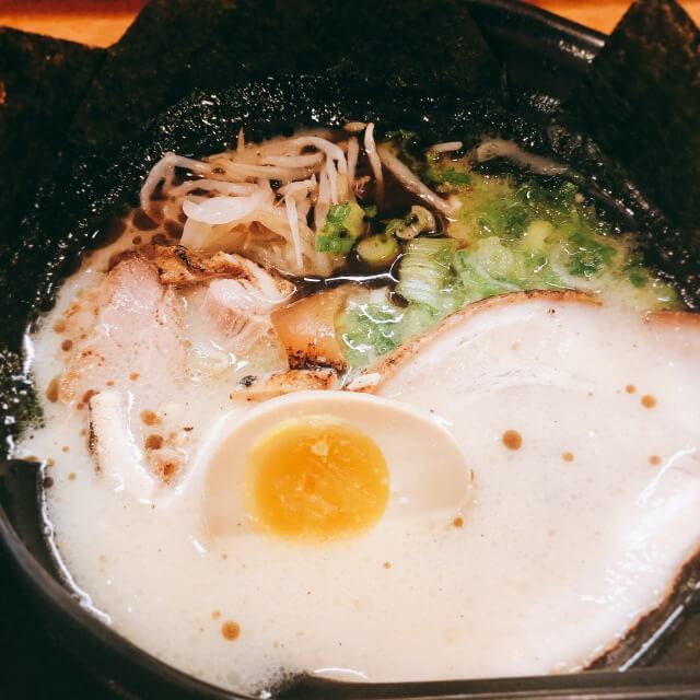 塩ベースの豚骨に海苔、チャーシュー、煮玉子、ネギ、もやしがトッピングされています。