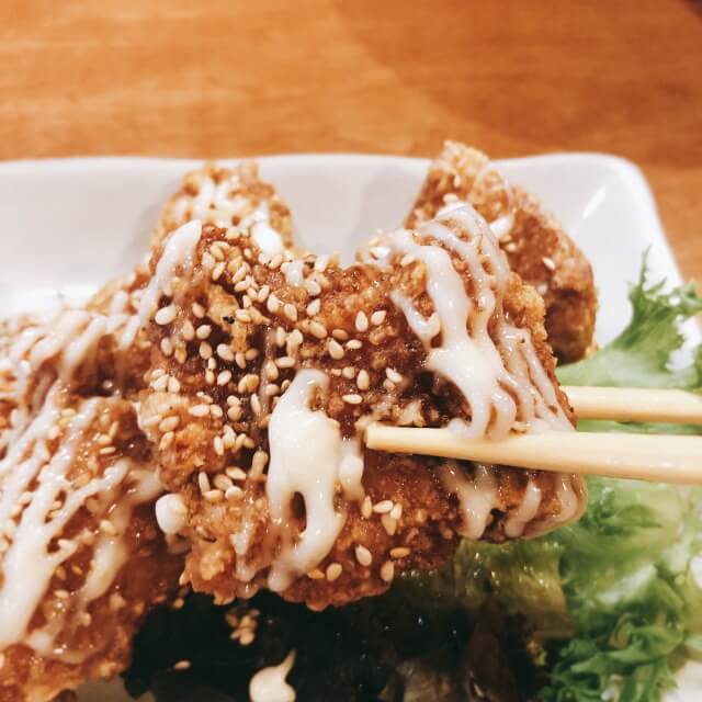 唐揚げの上にハチミツと胡麻、マヨネーズがかかりなんとも美味しそうです。