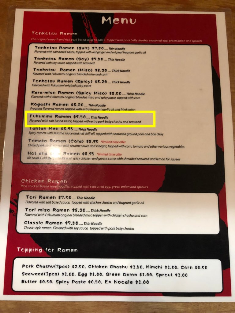 今回は店員さんに伺い一番人気のFukumimi Ramen 9.50ドルを注文しました。