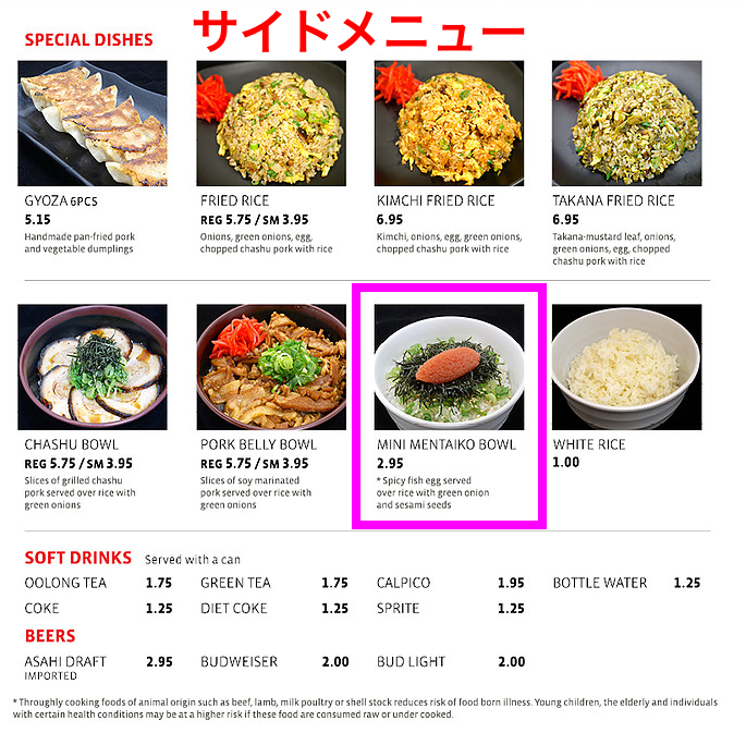 サイドメニューはラスベガスでは珍しいミニ明太子どん(Mini Mentaiko Bowl)2.95ドルを注文しました。
