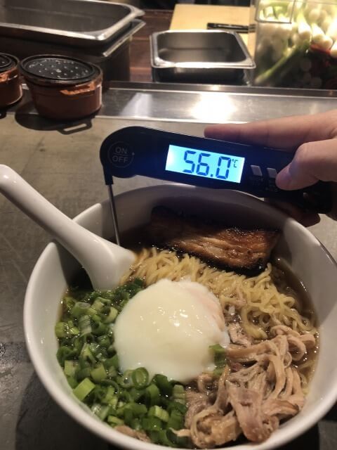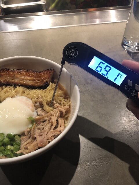 なぜ温度を測るかというと、米国(ラスベガス)のラーメンはスープがヌルいと言われています。