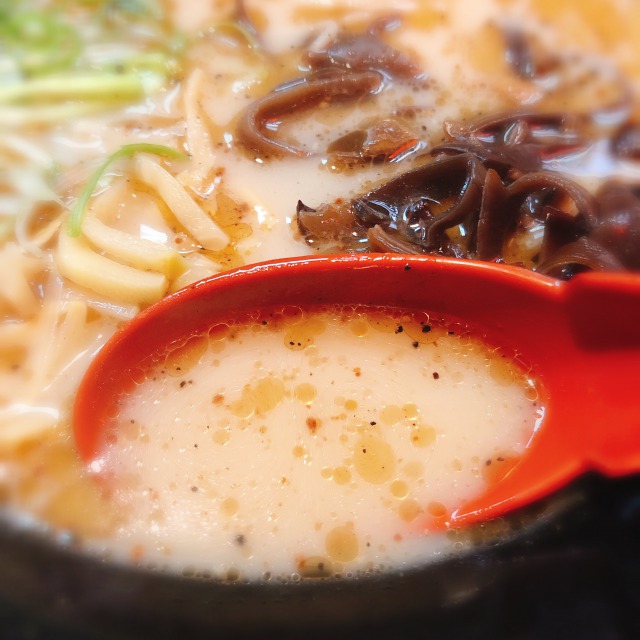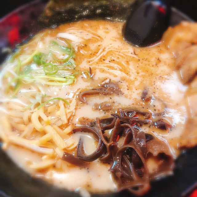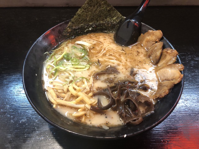 旨そうな豚骨スープの色にメンマ、キクラゲ、ねぎ、チャーシュー、海苔がトッピングされています。