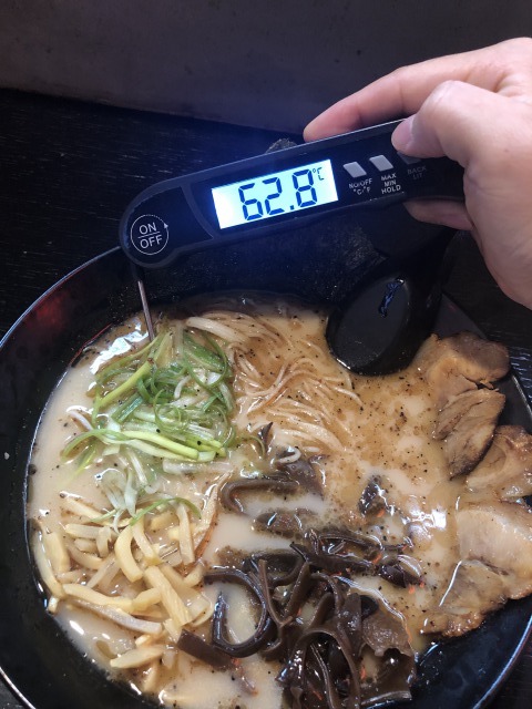 ちなみにラーメンの適温は70℃〜80℃といわれていますので、トミラーメンの豚骨は62.8℃で日本人からするとだいぶヌルく感じます。