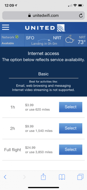 ユナイテッド航空の機内には有料のWiFiサービスがあります。(無料はありません。)