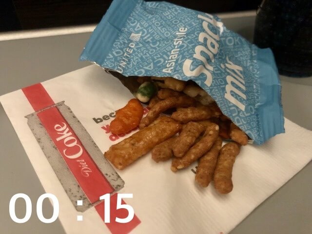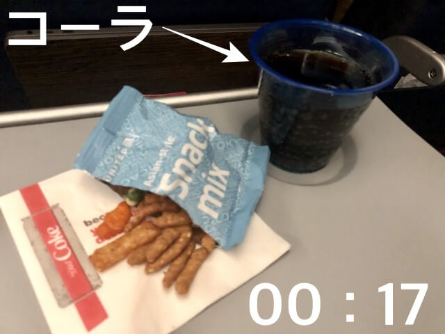 離陸後15分、飛行機が安定してタイミングでスナックが配られました。