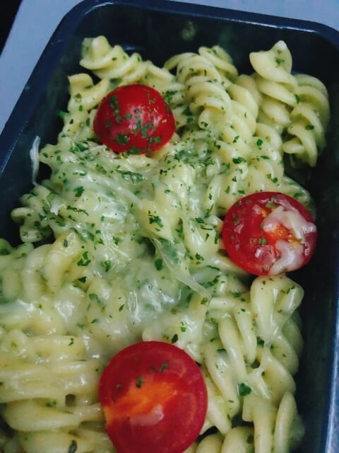 パスタはバジルとチーズソース、ミニトマトがのっていました。