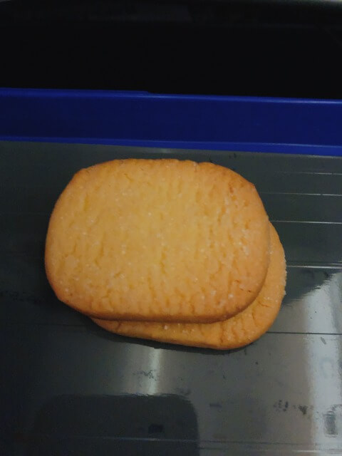 メニュー内容はオムレツ、ソーセージ、ハッシュドポテト、バタークッキーです。