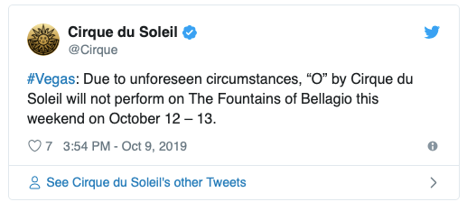 シルクドソレイユの公式ツイッターが現地時間10月9日に全無料公演の中止を発表しました。