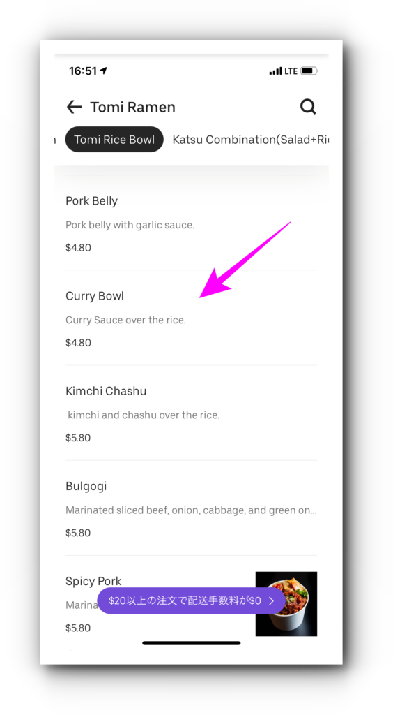さらにCurry Bowl 4.80ドル(カレーライス)のミニサイズを選択しました。