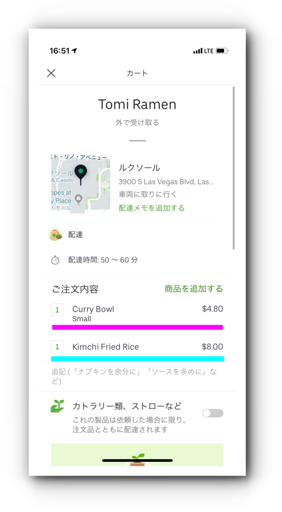 タクシーを使うと往復の運賃で20ドル以上は確実にお金がかかるため、レンタカーを借りて無い方はUber Eatsがオトクになります。