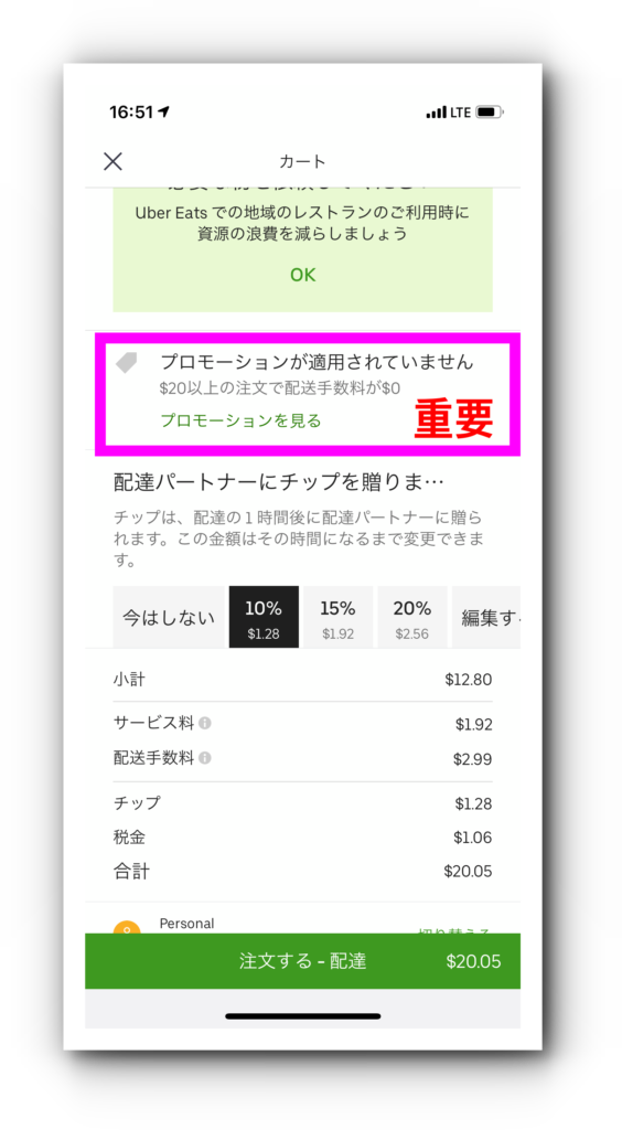 まだUber Eatsを使ったことのない方は以下のコードを注文前に入力すると最大で20ドル割引になります。
