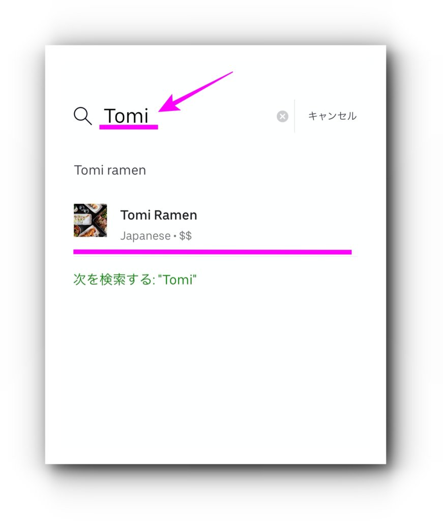 ”Tomi Ramen”と入力すると候補が現れました。
