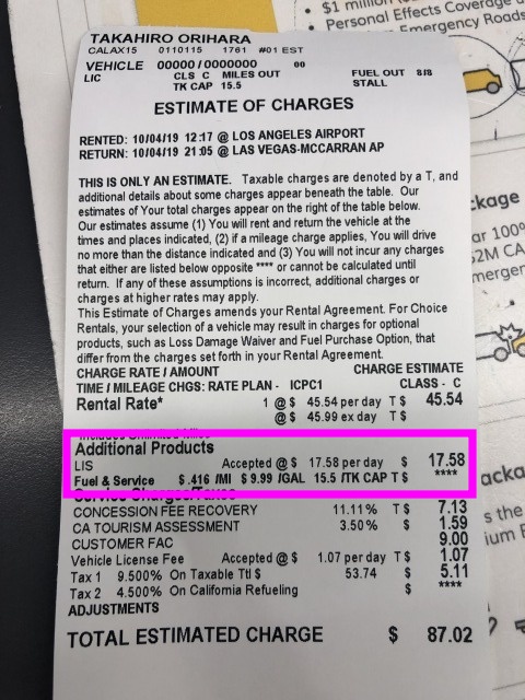 この17.58ドルは手数料であってさらにガソリン満タンまでの料金が上乗せされます。