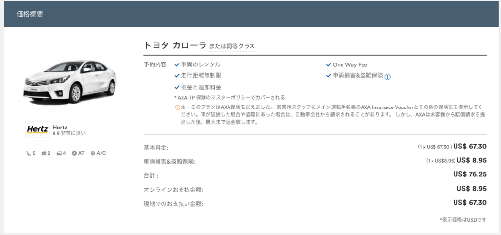 今回利用したハーツ社は大手のため値段は安い部類ではありませんが、9時間借りて67.30ドルはなかなかオトクな値段でした。