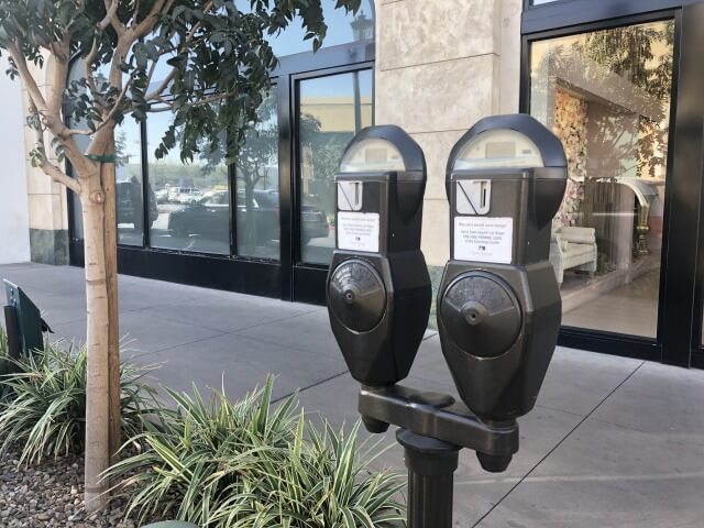 お店のすぐ脇に駐車する場合はお金がかかります。(↑写真:有料駐車エリアには料金メーターがあります。)