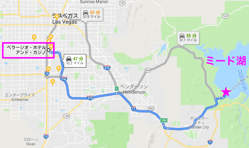 ラスベガス・ストリップからミード湖までは車でおよそ40分〜50分。