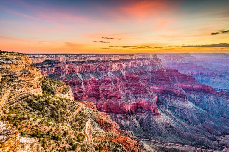 このタイミングにグランドキャニオンが太陽の光で赤く染まり、地層ごとに色の変化を楽しむことができます。