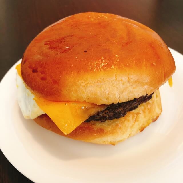 チーズバーガーの中身は半熟卵、チェダーチーズ、ミディアムレアに焼かれたアンガスビーフ。