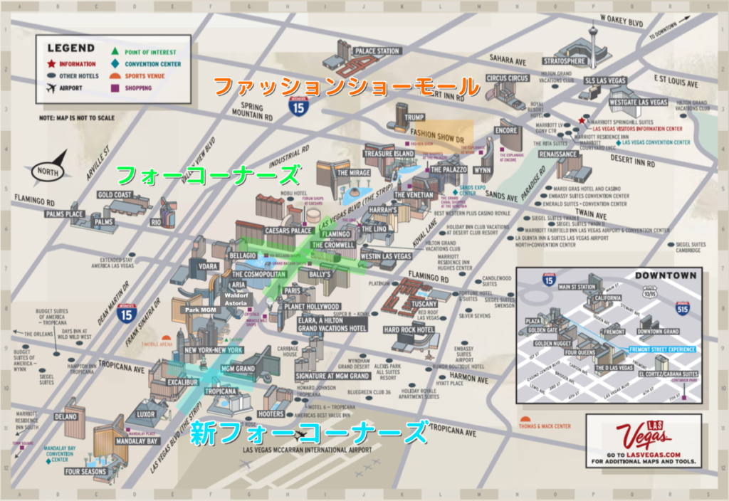 ラスベガス・ストリップとフラミンゴロードが交差する四つ角の場所でフォーコーナーズと言う名前がついています。