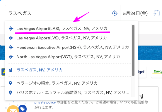 | 「ラスベガス」と入力すると自動で候補地が出てきます。空港のレンタカーセンターはピンク色の下線になります。 |