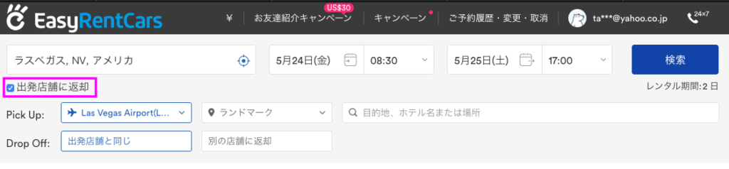 レンタカーを乗り捨てしたい。 いわゆる借りた場所ではないところに車を返却したい場合は「出発店舗に返却」のチェックマークを外し、DropOffの欄に希望地を入力してください。 |