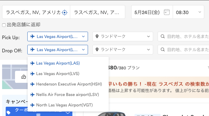 ↑トップページからまずはレンタルしたい場所の選択をします。 ラスベガスの場合、”空港のレンタカーセンター”が品揃えも多いため、価格競争が起こり安く借りることができます。車種も豊富です。 |