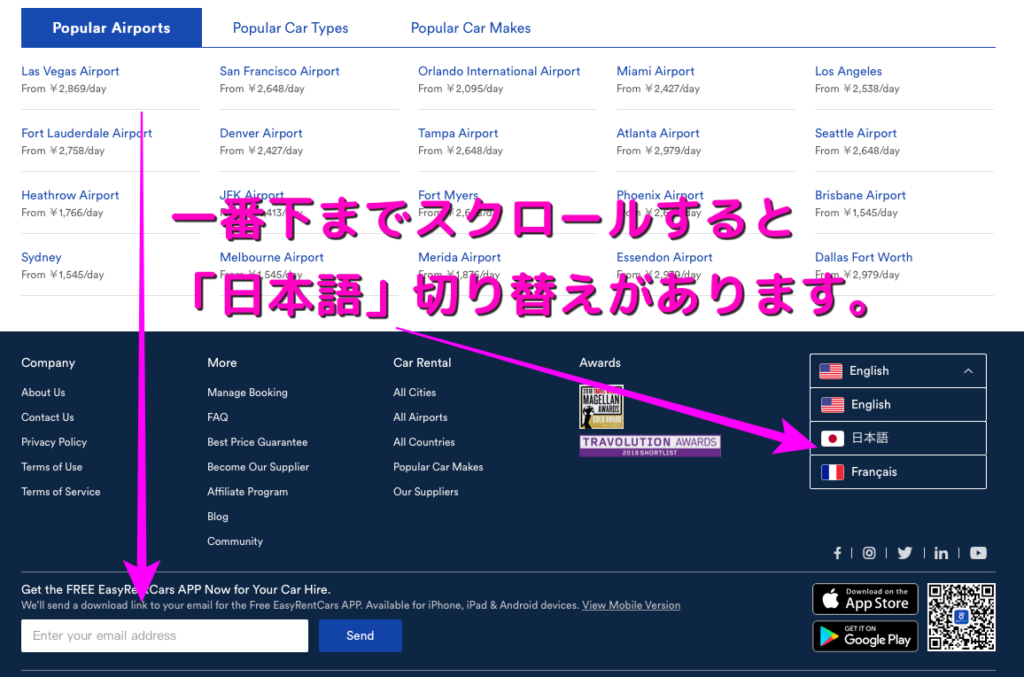 ウェブサイトは最初英語で表示されます。 トップページの一番下までスクロールし日本語に切り替えます。 |